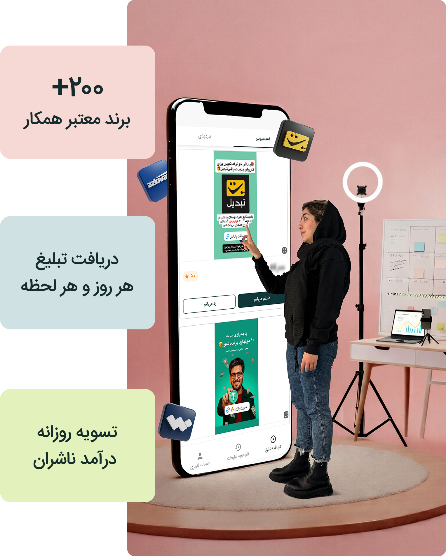 از طریق وب اپلیکیشن چاوش، به راحتی میتوانید تبلیغات را بررسی و انتخاب کنید و وضعیت درآمد خود را در یک محیط ساده و شفاف مشاهده کنید.
